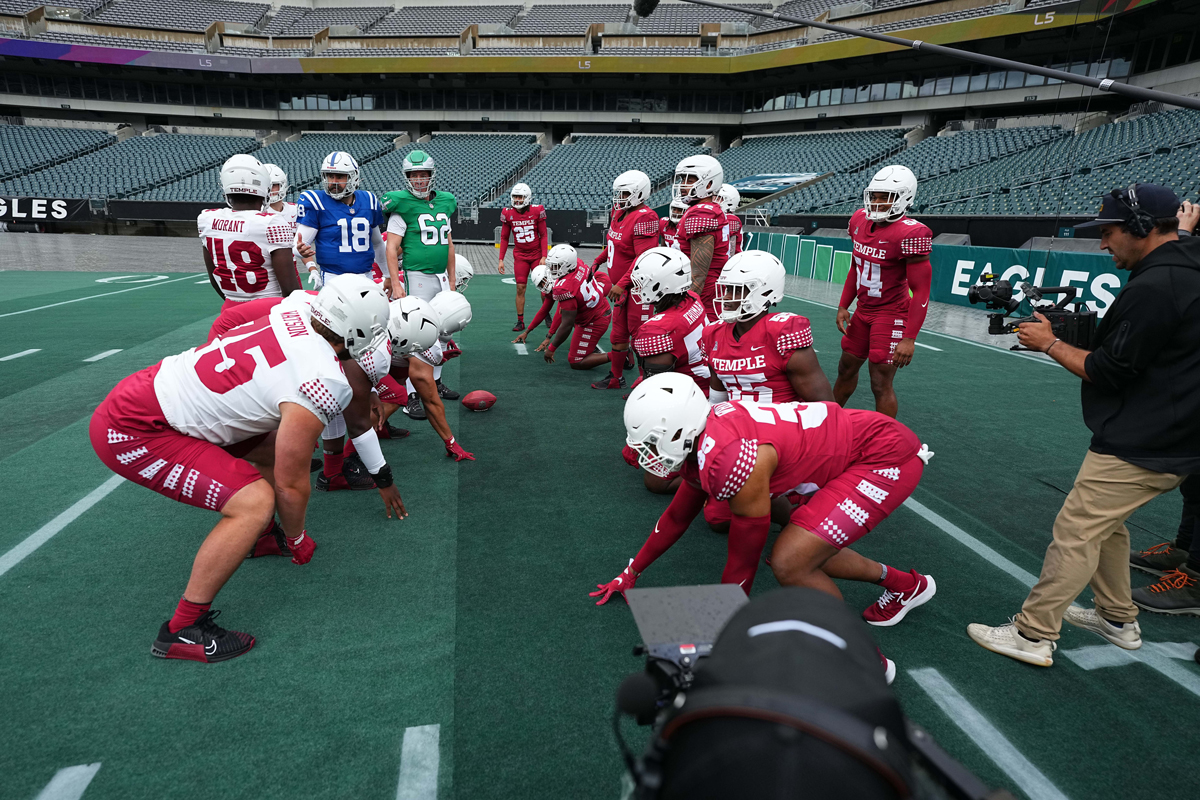On a rainy May morning, Temple’s football team headed to Lincoln Financial Field for a 7 a.m. call time to film the episode. Since the rain delayed filming, cameras followed Manning and Kelce indoors to study film and talk through the tush push.